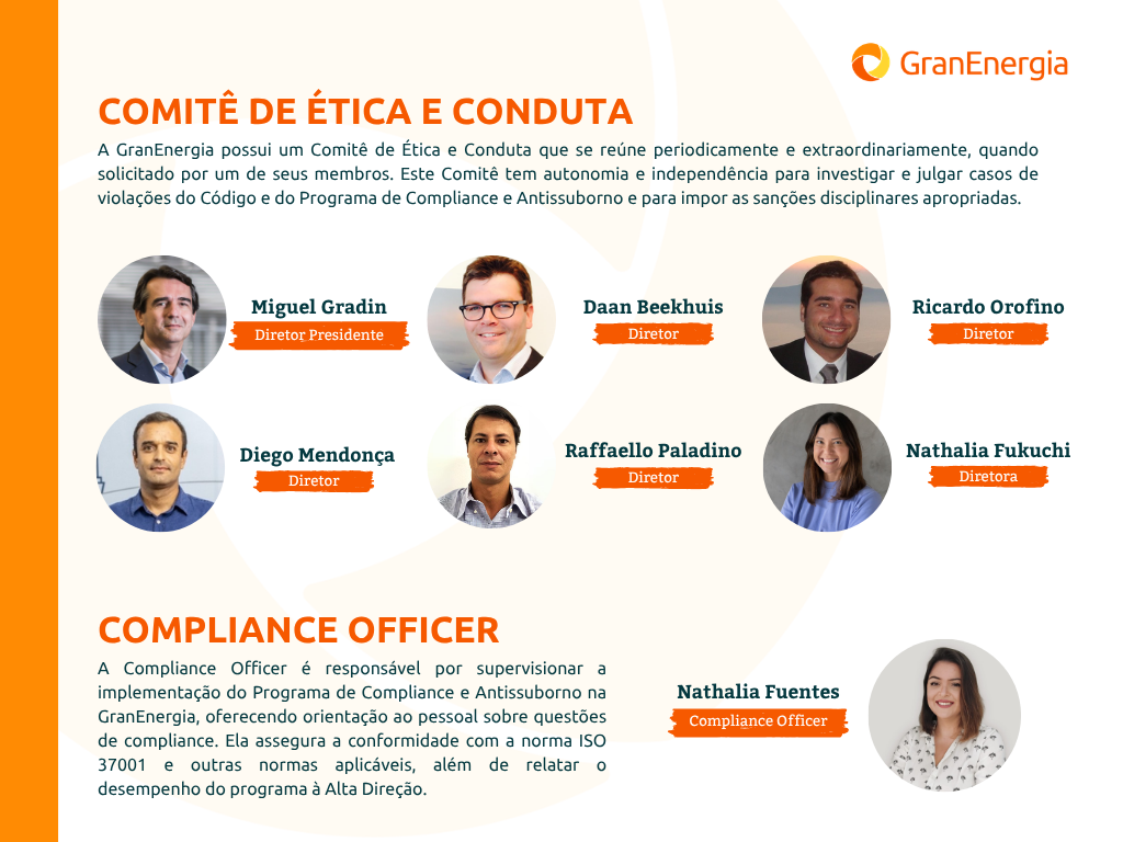 GranEnergia has an Ethics and Conduct Committee that meets ordinarily every six months and extraordinarily when requested by one of its members. This Committee has autonomy and independence to investigate and judge cases of violations of our Code and Compliance and Anti-Bribery Program and to impose appropriate disciplinary sanctions.